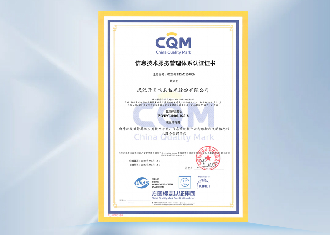 此次通过ISO20000体系认证,标志着开目软件已构建成包含组织架构、服务管理流程、IT支撑系统和IT服务管理信息的一体化管控体系,具备输出安全、可靠、高效的IT服务综合实力,IT管理和服务水平迈上了一个新台阶。