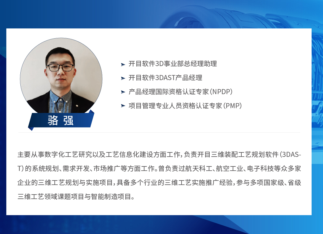 本期研讨会特邀开目公司3D事业部总经理助理/3DAST产品经理骆强先生,航天系统专家蒋科先生、中车南京浦镇车辆数字工艺专家李树栋先生,做客开目线上直播间,与您一同探讨制造企业如何部署和应用三维装配工艺规划与仿真系统,助力制造企业变革与创新。