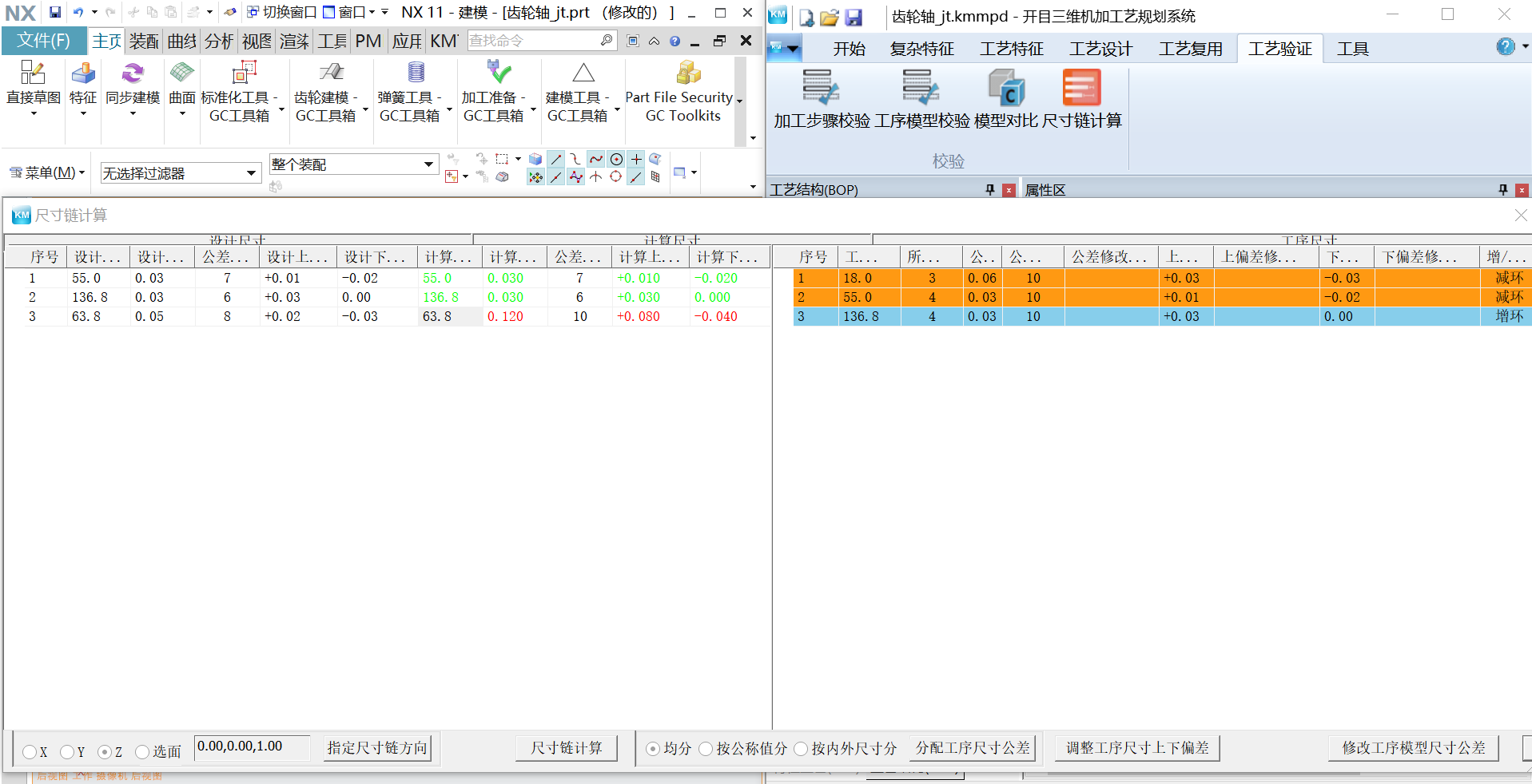 ? 基于PMI标注的尺寸链计算。基于模型上标注的PMI信息以及加工余量,对全工序模型进行封闭环、增环、减环的定义,进行尺寸链解算,构建尺寸链图??裳橹すば虺叽缌?,计算尺寸其公差是否符合设计尺寸公差要求,帮助验证、分析及避免工序尺寸公差错误,保证零件质量。