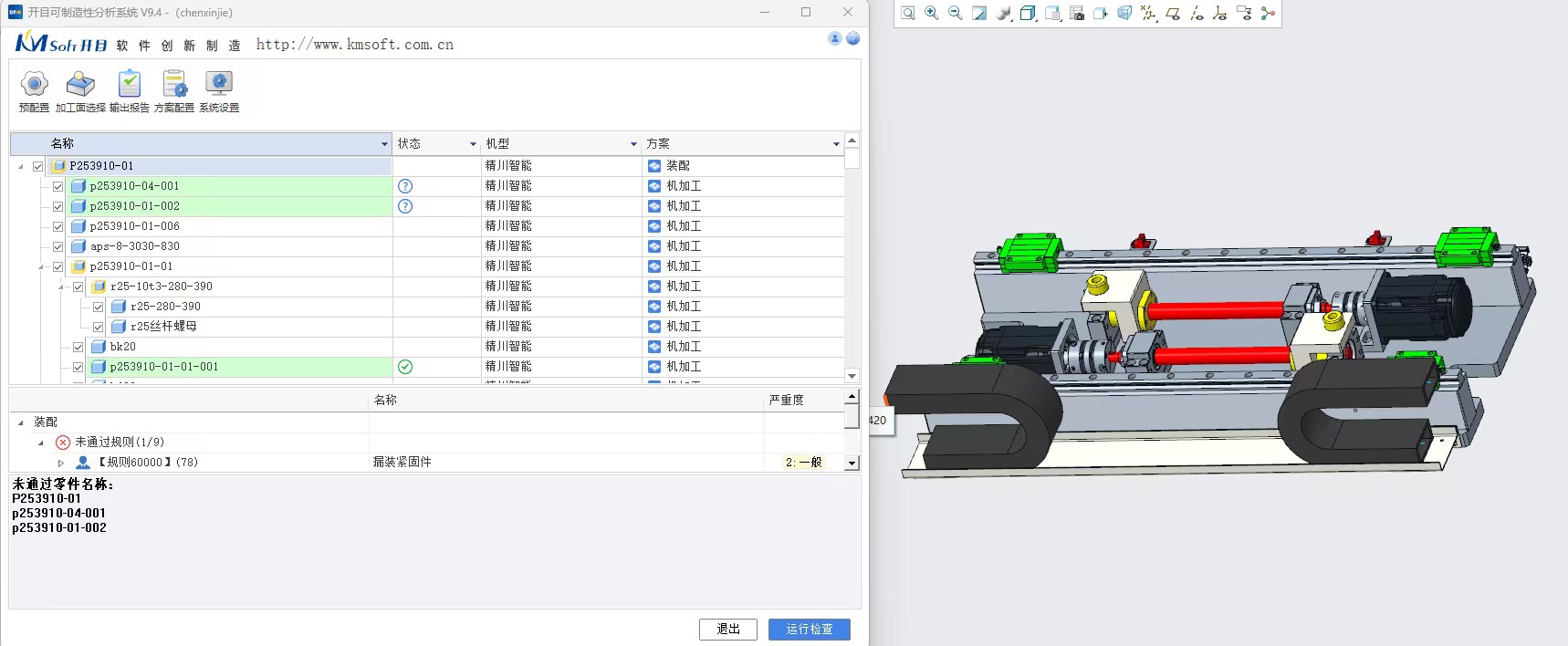 开目3DDFM基于企业实际工艺能力与生产场景,对100余条可制造性审查规则进行参数适配与优化,形成贴合企业需求的 “可制造性知识库”,在设计师完成数模设计后自动触发工艺性审查流程,实时识别设计中存在的制造难、无法制造或成本高的潜在问题,并直观提示问题位置、违规原因及优化建议。