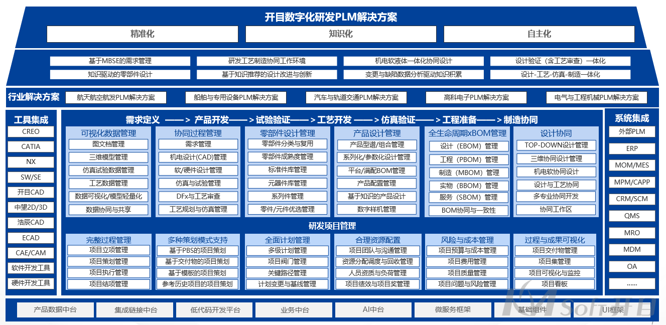 经过对业务部门的深入调研,以及多轮技术交流,开目团队最终为企业精心绘制了蓝图方案。项目将重点为企业搭建集团级的产品数据管理、流程管理、变更管理、项目管理、BOM管理、跨组织的设计协同管理、结构化工艺管理、系统集成等统一的产品全生命周期管理平台,实现对企业的产品数据从需求评估、立项、产品设计、样品、试产到量产的全业务过程管理,力争将沃德汽车部件打造汽车零部件制造行业的数字化转型新标杆。
